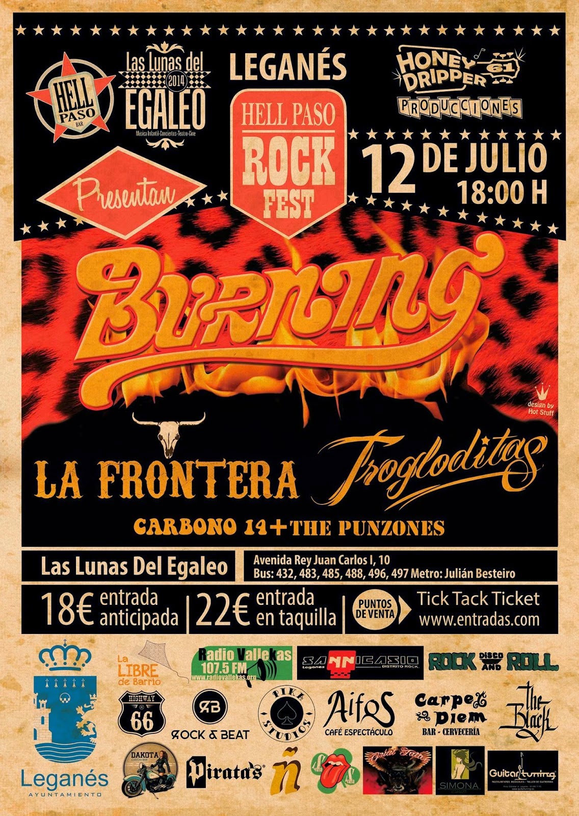 Una noche muy rockera la que se plantea para el día 12 de  Julio dentro de las noches del mítico Egaleo de Leganés. Encabezando el cartel BURNING, garantía de rock veterano y macarrilla que seguro que ponen a todo el mundo a “Mover las caderas”, a ritmo de clásicazos como “Esto es un atraco nena” o “Una noche sin ti”. Como invitados de lujo LA FRONTERA, la banda que facturó discos tan populares como “Rosa de los vientos” o el directo “Capturados vivos”, ahí es nada.