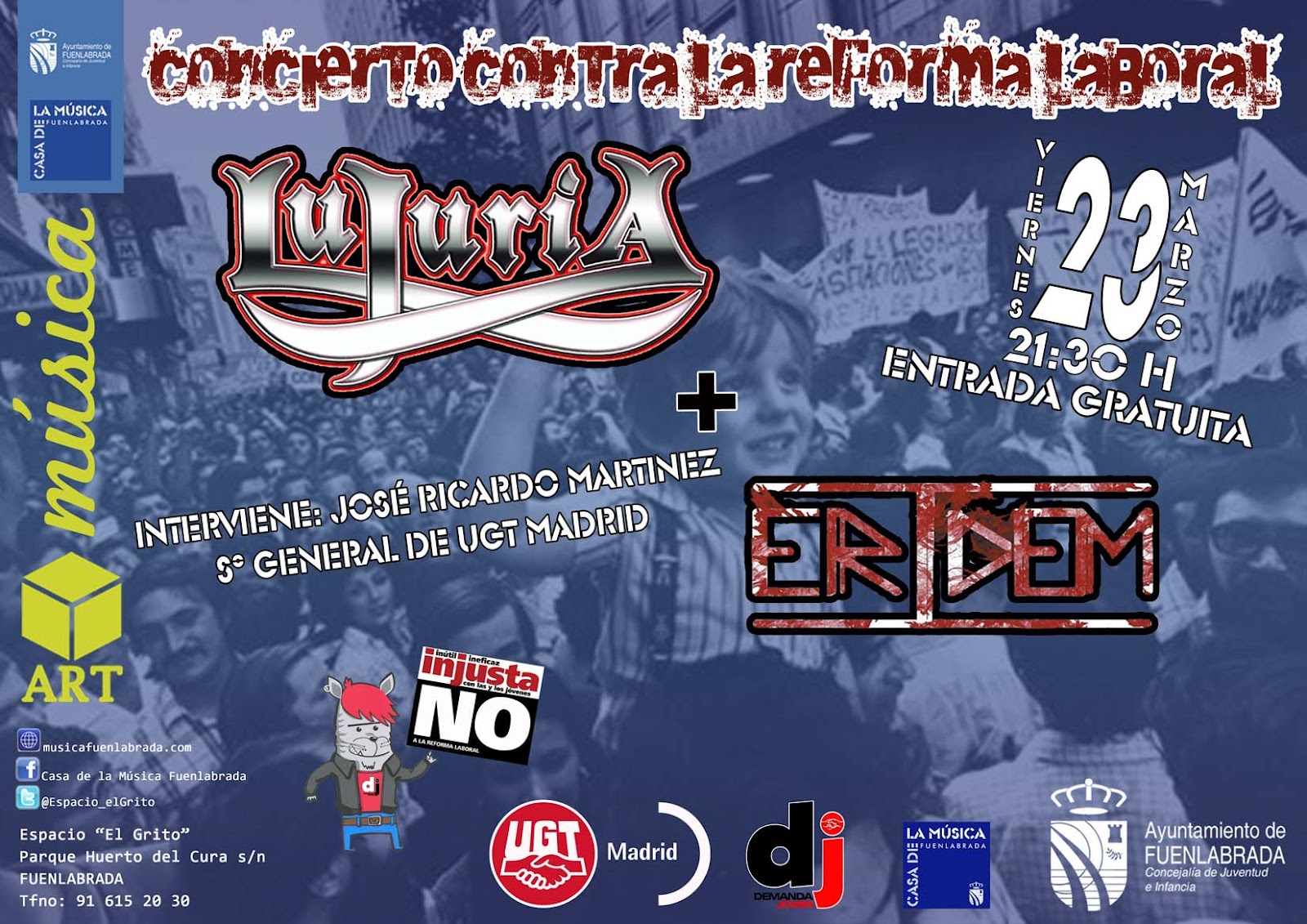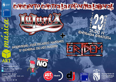 “Hola a todos, os escribo para informaros de que nos ha llamado UGT para hacer un concierto contra la reforma laboral (que nos quiere imponer el PP) el viernes 23 en la sala el Grito de Fuenlabrada. La entrada es gratuita, y tocamos nosotros y ÉRIDEM e interviene también el secretario general de UGT de Madrid José Riocardo Martínez. Me atrevo a molestaros por la importancia de la causa, una lucha que LUJURIA, y seguro que vosotros, nos creemos a muerte, y es que hay que parar esta reforma laboral. Nos haríais un favor enorme si nos ayudais a difundirlo un poco, a nosotros y a toda la clase trabajadora. Todo lo que se haga es poco. Gracias por leerme, os paso el cartel. Un abrazo grande Salud y Huelga General”.