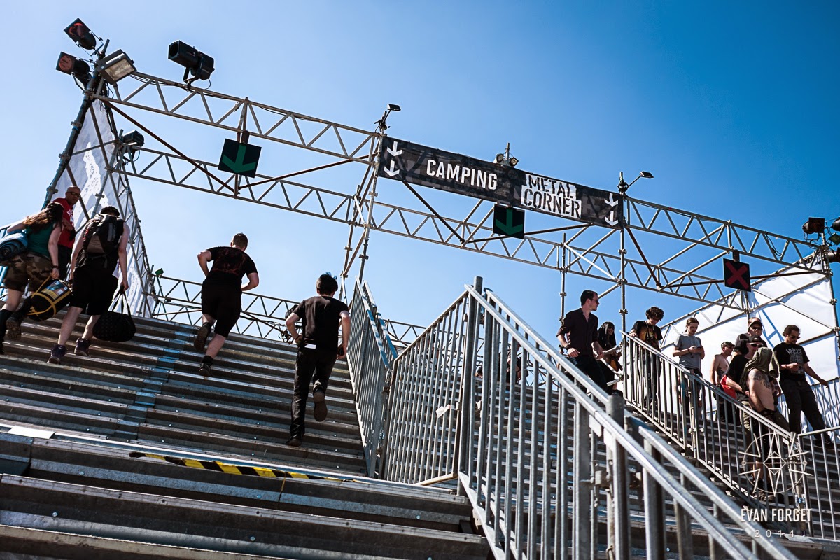 Otra sorpresa, esta no precisamente positiva, fue ver que desde este pre-recinto se accedía a la zona de acampada mediante un puente construido con unas escaleras muy difíciles de subir con todos el equipamiento que para un evento de estas características lleva la gente que va a acampar. Ese es un punto a tener en cuenta para otras ediciones puesto que las quejas eran generalizadas. Y también el de incrementar los bares disponibles durante el primer día, absolutamente saturados por miles de personas que comenzaban a llegar en riadas de metaleros ávidos de festival.