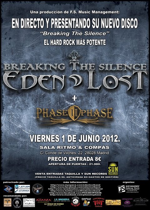 Nuestros amigos de EDEN LOST presentan su excelente “Breaking the silence” este viernes en Madrid. Con un inesperado cambio en la formación de última hora (el guitarrista original Javi Nieto ha tenido que dejar la banda por motivos personales, y será el propio cantante Ignacio Prieto el que se haga cargo de la segunda guitarra), la banda demostrará porqué son una de las mejores bandas de hard rock que tenemos en nuestro país en la actualidad.