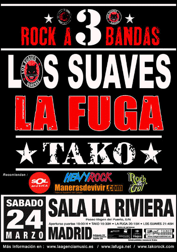 Ya llega a Madrid la esperada fecha en la capital de esa interesante gira llamada “Rock a 3 bandas” que está llevando a LOS SUAVES+LA FUGA+TAKO por lugares escogidos de la península. Será una noche increíble de rock en castellano que todos los seguidores de las tres bandas no nos podemos perder. Orense, Reinosa (Cantabria) y Ejea de los Caballeros (Zaragoza) hermanados en un show triple de los que nos gustan a los corsarios.
