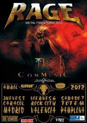 Esta semana vienen de nuevo los alemanes RAGE a visitarnos a nuestro país. Presentando sus reciente “21”, un disco cañero y acelerado como pocos, no extraña que vengan acompañadas de dos formaciones más extremas de lo habitual en sus visitas: TYR y COMMUNIC. Peavy, Victor y Andrè, demostrando que siguen siendo una excelente tripleta en directo y además una de nuestras bandas más queridas.