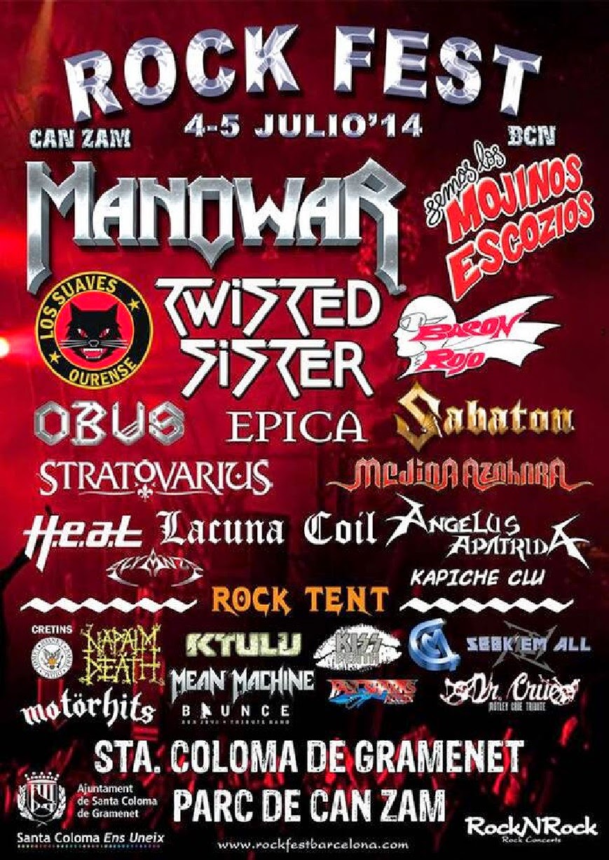El 4 y 5 de Julio tendrá lugar el ROCK FEST BARCELONA en el parque de Can Zam. Una cita festivalera con un gran y variado cartel que recopila un buen puñado de bandas de todos los estilos duros.Como ejemplo unos cuantos nombres: empezando por la parte alta del cartel MANOWAR y TWISTED SISTER, cada uno con su manera de entender el Heavy Metal, y a cada cuál más legendario; también participa en el festival lo más granado del metal nacional, desde unos OBÚS, MEDINA AZAHARA o BARÓN ROJO a LOS SUAVES y ANGELUS APATRIDA, sin olvidar la caña de KTULU y la diversión con MOJINOS ESCOZÍOS.